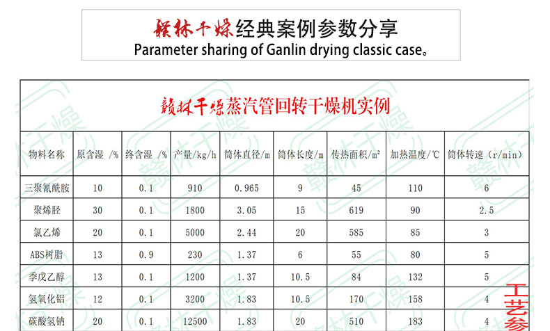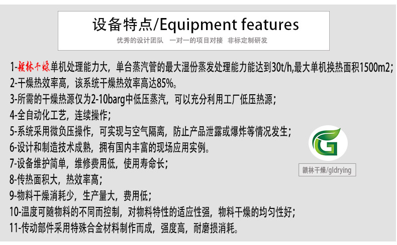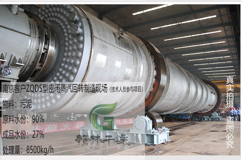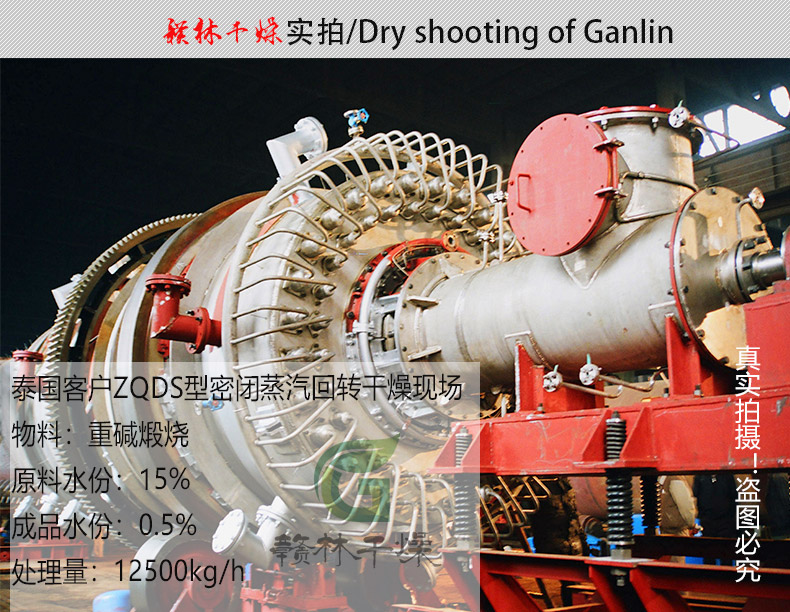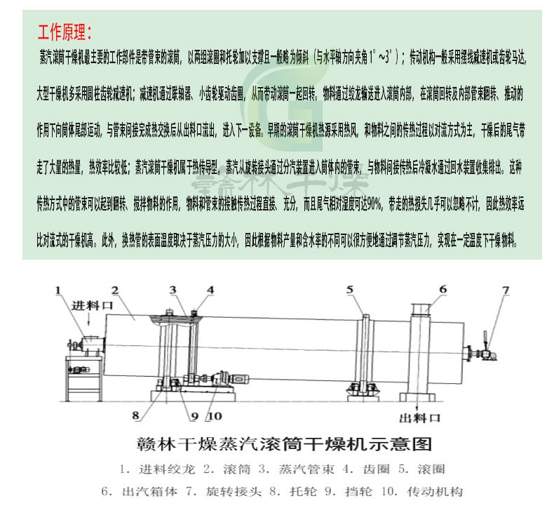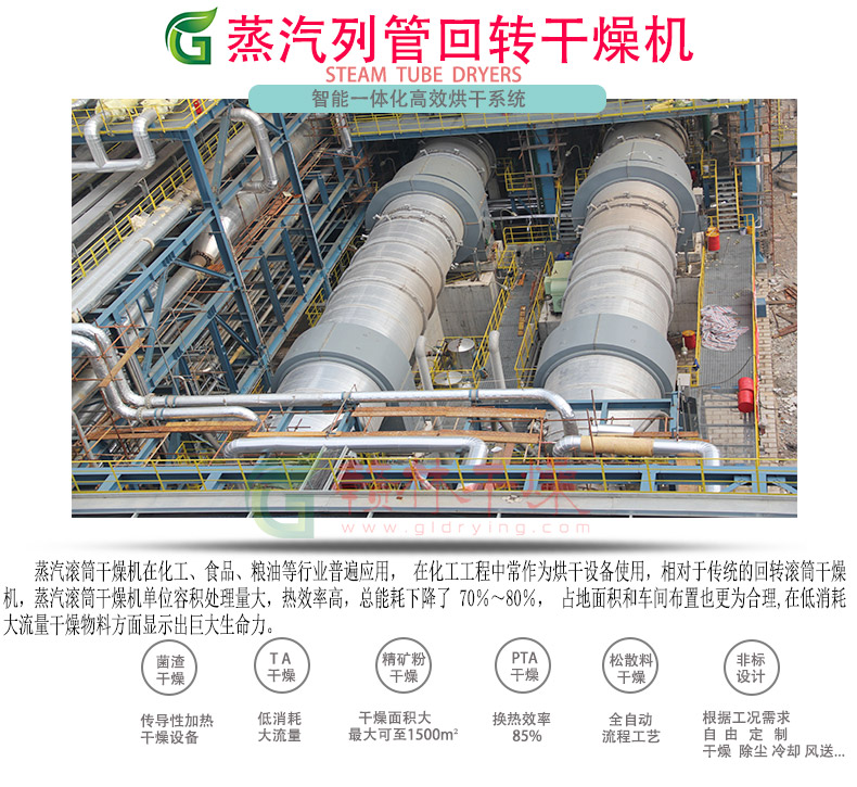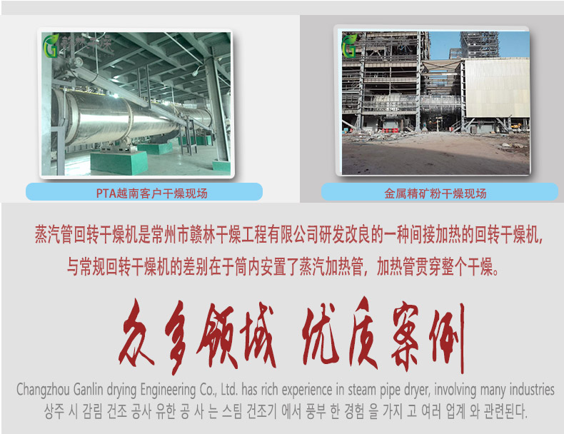產品簡介: 蒸汽間接法滾筒干燥機在化工、食品、糧油等行業普遍應用, 在化工工程中常作為烘干設備使用,相對于傳統的回轉滾筒干燥機,蒸汽滾筒干燥機單位容積處理量大,熱效率高,總能耗相對于常規熱風干燥設備,其能耗要比熱風干燥設備低30%~40%, 同時沒有熱風系統設備,設備占地面積小。車間布置也更為簡單。 蒸汽管回轉干燥機是常州市贛林干燥工程有限公司自行設計研發改良的一種間接加熱的回轉干燥機,與常規回轉干燥機的差別在于筒內安置了蒸汽加熱管,加熱管貫穿整個干燥。大大提高了設備的干燥效率。