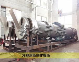 物料通過(guò)高度煅燒后進(jìn)入回轉(zhuǎn)滾筒內(nèi)部。冷卻水通過(guò)循環(huán)水泵進(jìn)入滾筒外夾套,熱的物料在滾筒筒體內(nèi)壁不斷地交換接觸面,從而實(shí)現(xiàn)冷卻